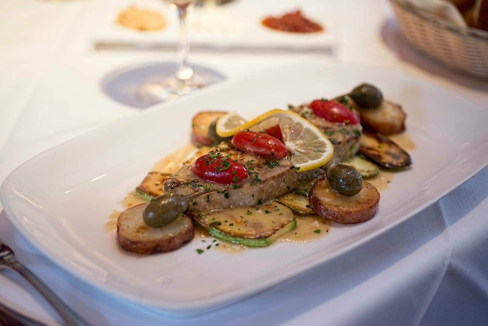 Grilled filet of salmon with grilled vegetables in a white wine lemon capers sauce (GF Opt)